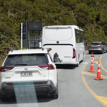 Další den, možná dva, nevím, jsme se vyškrábali přes kopce zase nahoru a dolů a zjistili, že plně naložení v serpentinách máme rozkošnou a závratnou rychlost někde kolem padesátky, šedesátky, podle sklonu silnice. Ale my jsme na výletě a když se nekoukáte moc do zrcátek, tak se jede hezky. Ba ne, tam kde to jde, se snažíme vždy rychlejší auta pustit před nás. Ale jízdní styl kiwáků je teda za nás nic moc. Kdybychom chtěli brečet po Kanadě, řekli bychom, že tam na nás za celý rok nezatroubilo jediné auto, všichni nás všude pustili, drželi si bezpečný odstup a všichni se na nás usmívali a na Zélandu jezdí dementi. Teda dementy se stanou ve chvíli, kdy otočí klíčkem v zapalování auta. Jsou netrpěliví, lepí se na vás, obzvlášť kamiony, rozhodně vás nikam nepustí a když můžou, tak na vás troubí. No a nebo taky možná mají jen kopřivku z obytňáků, které jsou všude a pořád se chtějí jen někde kochat.