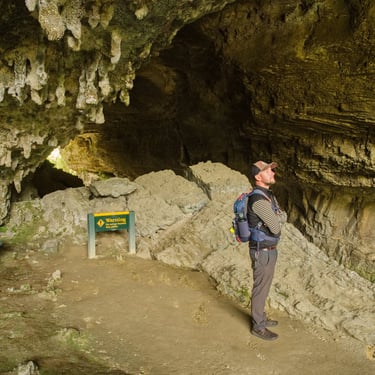 Zastavili jsme ve vesnici Karamea. Ospalému místu, kde lišky dávají dobrou noc a z našeho pohledu ve vesnici bydlí jen důchodci a pár maníků, kteří se tam jeli schovat před světem a ruchem. Za ragbyovým hřištěm byl malý kemp pro pár aut, ale aspoň jsme vyprali. V jednu chvíli jsme si všimli přijíždějící dodávky. Jen tak zběžným pohledem jsme prohlásili, že to musí být Němci a ženská, že se určitě jmenuje teď už nevím jak, ale o deset minut později se s námi důchodci z dodávky dali do řeči a v první větě z nich vypadlo, že jsou z Německa a paní, že se jmenuje přesně tak, jak jsem odhadl. Vtipná náhoda. Nakonec jsme s nimi prokecali dobrou hodinku. Říkali, že si na druhý den zaplatili výlet offroadem do přilehlých jeskyní každý asi za dvě stě dolarů. My jsme tam měli namířeno také. Po přečtení recenzí na internetu jsme se dozvěděli, že se na místo jede po nezpevněné cestě asi 16 kilometrů a že doporučují dodávkami na cestu vůbec nevjíždět. Některé recenze však psali zase opak. My byli docela na vážkách vzhledem k našim předchozím zkušenostem z Rumunska, kde jsme se nechtěně ocitli s Lavinou na cestách, kudy jsme vážně jet nechtěli. Lavina jako správná čtyřkolka to dala, ale mé nervy byly docela napnuté. Tedy druhý den jsme zastavili s Tsunami na začátku cesty a dali se do čtení všech cedulí, které vjíždění dodávkám nebo přívěsům vůbec nedoporučovali, že cesta je úzká, velmi klikatá a chybí místa na míjení dvou aut. No vydali jsme se. Po pár sto metrech jsme minuli kontrolní bránu určující maximální výšku, pod kterou jsme se vešli ještě s asi dvaceticentimetrovou rezervou a v očekávání se vydali stoupat nahoru. V každé zatáčce jsme si říkali, tohle ještě není tak hrozné a vypadá to i docela v pohodě. Přišlo jedno štěrkové stoupání s roletou, druhé, třetí… Jeden přejezd mostu, druhý, zatáčka, zatáčka. Pořád napjatí jak struna. No a najednou jsme byli na posledním parkovišti. Čekali jste průser, že jo?! My taky. A on nakonec vůbec nikdy nepřišel a stav cesty jsme nakonec zhodnotili lepší, než kdejaká středočeská silnice. Samotné jeskyně jsou pak součástí koryta řeky, která si staletími různě vykotlala svojí cestu skrz skály a místy vytvořila nádherné skalní mosty, jinde přímo jeskyně. Celkově pak místo bylo pospojované sérií kratších procházek vždy kilometr, dva, tři dlouhých a během dopoledne jsme je nakonec prošli všechny. Oproti důchodcům, kteří za výlet zaplatili čtyřista dolarů, jsme tak zůstali ochuzeni jen o jednu část, která byla za bránou, ale dle fotek byla stejná, jako všechny ostatní.