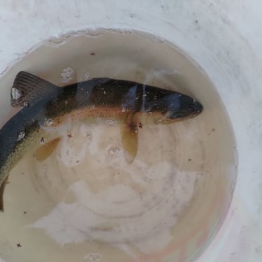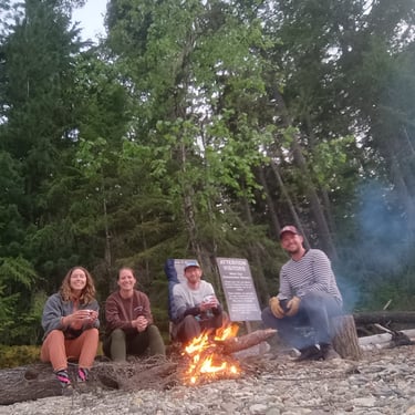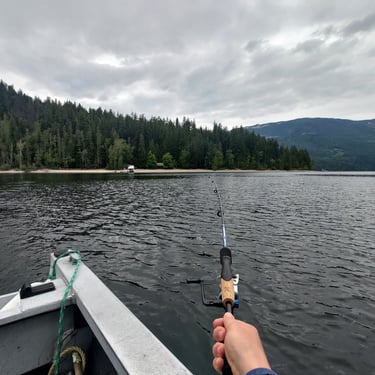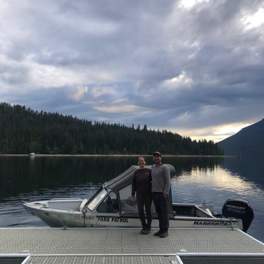 Denní rutinu nám sem tam zpestří zajímavější chvíle a dny. Hned první týden shodou okolností „kolem nás“ projížděli naši kamarádi Emma a Charlie z Callaghanu, se kterými jsme vlastně bohužel nikdy neměli čas si v klidu sednout a strávit delší čas a společné chvíle byly jen každou středu, při každotýdenní výměně na chatě. Nu a shodou okolností zase ve středu nám napsali, že pojedou kolem z výletu do Yukonu a jestli bychom se s nimi nechtěli sejít ve městě na oběd. Hned jsme souhlasili, přijeli za nimi do přístavu a prošli si společně Sicamous. Oběd se nám začal protahovat a moc hezky se sedělo. Když se s námi přišli loučit do maríny, nabídli jsme jim krátké svezení lodičkou. Projíždíme úžinou, povídáme si, jaká je škoda, že už musejí jet do Vancouveru neb jim asi za tři dny letělo letadlo zpátky do Anglie. No chviličku jsme je naťukávali a dřív než jsme se dostali na konec přístavní úžiny, už jsme otáčeli zpět pro jejich spacáky. Navečer jsme rozdělali oheň a k tomu jsme darem dostali jejich malý rybářský prut, o kterém jsme předtím u oběda básnili, jak si ho nutně musíme koupit, když už jsme na tom jezeře. Naše úžina v parku má totiž být nejlepším místem na jezeře pro chytání duhových pstruhů. S rybařením to je tady ale trochu zapeklitá situace. Rybářský lístek zaplatíte celkem snadno, musíte si ale k němu přikoupit speciální povolení na naše jezero. K tomu přikoupit povolenku na chytání pstruhů (případně lososů, každá je zvlášť). No a když máte tohle všechno, ještě panují velmi přísná pravidla jakým způsobem a na co smíte ryby chytat. Závěrem pokud něco chytíte a rybu si chcete nechat, musí mít pstruh alespoň půl metru a losos 60cm. K tomu si jich za sezónu na jeden lístek můžete nechat pouze pět kusů od každého. Koneckonců s počtem lidí na jezeře a starostí o přírodu všechna omezení dávají smysl. My si nakonec pořídili ještě druhý prut a hned o pár dní později chytli naši první rybu. Pstruha. Byl ale příliš malý a my ho tak museli zase pustit.