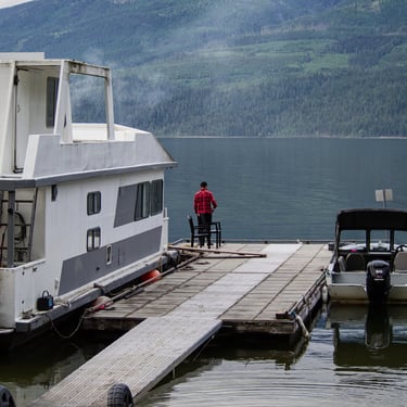 My tedy na čas, jak je naším zvykem, ve 13:30 zastavujeme auto uprostřed silnice před marínou a začneme naloďovat všechny naše věci. Čtyři kufry (odjížděli jsme se dvěma), čtyři batohy, volně ložené tašky, nákup jídla, náruč oblečení, dvě skládací kola, obrázky k výzdobě houseboatu, boty, polštářky a další píčoviny. Šéf nehne ani brvou a dodává, že za roky, kdy se mu střídají jednotliví strážci, viděl už tolik věcí, že ho nic nemůže překvapit. Loď je plná, auto prázdné a hned začneme z ostra. Cory nám nakáže nalodit i nás, že s náma rovnou couvne do vody, já že nastartuju a zaparkuju k molu v maríně. Žádné vysvětlování, nic. Očekává, že máme naše lodní řidičáky a zkrátka nám asi věří. Mno. Musíme si věřit tedy i my. Zaparkovat naštěstí zvládáme na poprvé a v celku jemně. Uf. Pokud jste čekali divadlo, my ho očekávali také, ale alespoň jednou se něco obešlo bez dramat. Loď je ve vodě, teď se zbavit auta. Neparkujeme nakonec totiž v maríně, ale kus dál v oploceném areálu. Je to asi 5 minut pěšky, což se později ukáže jako pěkná otrava, ale nedá se nic dělat. Šéf nás zve do Tim Hortons na rychlý oběd, kde nám dává podepsat daňové papíry, smlouvy nikoliv (ty vlastně nemáme podepsané do dneška). Začne nám různě popisovat, co nás bude čekat, jak máme co dělat a další plány. Dodává, že nám toho nebude vysvětlovat moc, že za tři dny se na nás přijede podívat, stráví s námi celý den a všechno nám pěkně ukáže. V maríně nastupuje do své lodi, my do té naší. Dodává něco jako, pojeďte za mnou, nemůžete se ztratit. Víc k navigaci nebo k tomu, jak máme s lodí zacházet, ne. Tedy startujeme, obracíme loď a vyrážíme za ním. Celé jezero má tvar tiskacího H. Sicamous leží v polovině pravé spodní nožičky, městem prochází úžina s loděnicemi a pak pokračuje další jezero (Mara). Naše marína je vlastně na konci města a musíme se probrblat celou úžinou. Zde platí zákaz rychlé jízdy a vytváření vln. Tedy na první rozjezd aspoň zvolna, ale v pomalé rychlosti loď zase reaguje pomaleji. Máme za sebou se Zuzkou ježdění na motorových člunech na Sicílii, alespoň pouze pár. Já k tomu mám české papíry na loď, včetně plachetnice a přímořské plavby a čerstvě i kanadské lodní papíry, ale stejně máme docela respekt a nechceme něco posrat hned první den. Úžina končí podjezdem pod dvěma mosty, jedním železničním a druhým, opravovaným, dálničním. Když koukáme na to, jak blízko jsme před tím byli, znovu pěníme vzteky. Ano byla naše chyba, že jsme si v Salmon Arm nevšimli asi tak třímetrové cedule, že se dálnice opravuje a že je zavřená od pondělí do soboty mezi devátou ráno a třetí odpolko.