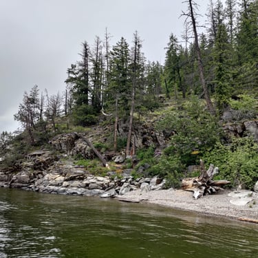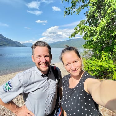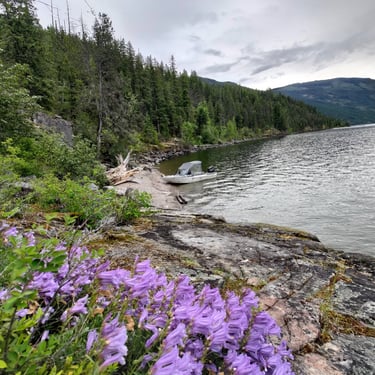 Od flekatých jezer, přes Okanagan na sever se příroda pomalu začala měnit více do Kanadska. Postupně začalo ubývat borovic a přibývat smrků. Vinice a sady vystřídaly pole a hned potom louky a koně. Hodně koní, všude koně. Farmy, traktory, koně. Před příjezdem do kempu nakupujeme ještě nějaký alkohol a brambůrky, že jsme líní vařit a k ohni to bude stačit. Z kempu se vyklube trochu podivné místo u řeky se svérázným majitelem, zanedbanými místy s přerostlou trávou a ještě svéráznějším zahradním uměním. Celkový dojem je asi takový, že čůrat Zuzka odmítá jít sama, hned poté, co roztáhneme stan cvakneme každý dva drinky s pytlíkem brambůrek a jdeme spát. V noci se ještě přidá drobný déšť. My se ještě bavíme, na kolikátou nastavíme budík, já přidávám rezervní půl hodinu a jdeme spát. Od rána samozřejmě nestíháme. Jsme nějak pomalí a trvá nám hrozně dlouho, než se vypakujeme, i když jsme vlastně vůbec vypakovaní nebyli. Druhé místo na jezeře, které jsme si vyhlídly jako větší město, kam asi budeme běžně jezdit nakoupit je od nás půl hodinky a my se rozhodneme jet tam a před nakouknout, jestli bude město stát za to. Mají tu naše oblíbené Save on Foods (potraviny), kde kupujeme snídani a okukujeme první květiny. V duchu i nahlas se chválíme, že jsme moudře navrhli se sejít až v poledne, protože navigace nám ukazuje příjezd přesně ve dvanáct a to jsme se nikde nerozhlíželi a k snídani se odbyli bagetou v autě.