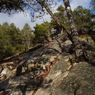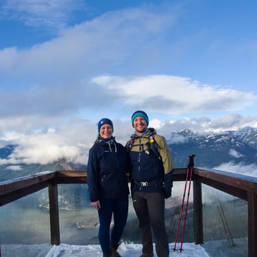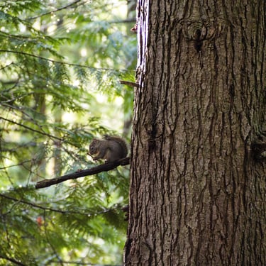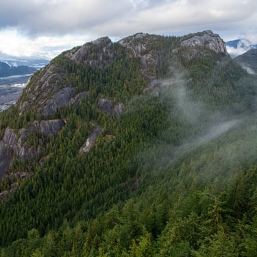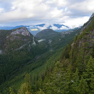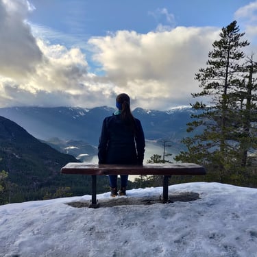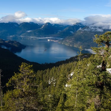 Jiný den, asi v pondělí (možná úterý), dáváme výlet kousíček za Squamishem směrem na jih. Hned vedle dálnice je jezero a u něj odpočívadlo. Od parkoviště se dá vběhnout do lesa a do skal směrem k nejvyššímu bodu Watts point. Opět nás uchvacuje příroda, která mi připomíná trochu Labák, možná České Švýcarsko. Kdyby to byl pískovec a ty skály byly jednotlivé věže. Ale spíš tak obecně, to je tady všude lezecké porno. Proplétáme se jehličnatým lesem, trochu poprchává, trochu mlha, trochu sluníčko. Stoupáme podél skalních masivů a míjíme jednotlivé vyhlídky na fjord a okolní kopce. Místy to je až neskutečný kýč, kdy máte pod sebou nějakých 100 metrů hloubky, holou plošinu na skále, na ní přivrtanou lavičku a epický výhled na jih do zálivu, který vám rámují lesy a hory. Jo a je pár stupňů nad nulou, ale vám do obličeje svítí v poledne jižní sluníčko. Shodujeme se, že pokud budeme dál bydlet ve Squamishi a někdo za námi přijede, určitě ho vezmeme sem.