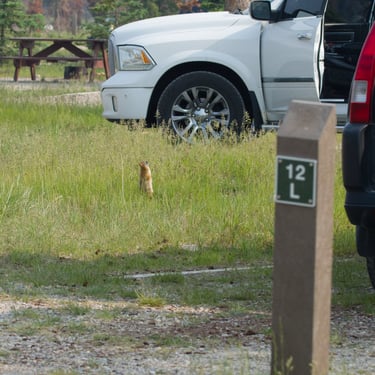 To, že se blížíme k městu Jasper, nám bohužel dala najevo příroda. Loni na podzim okolí města i město samotné spálil obrovský požár. Před odjezdem na výlet, jsme se trochu obávali, jaké to tu bude, kolik míst bude zavřených, jaké bude ubytování a všechno ostatní, ale nakonec zvítězil pocit, že bychom turismus naopak v místě měli podpořit a vyrazit. I když vše kolem nás bylo spálené na popel a místo lesa trčely kolem silnice jen pahýly, bylo to krásné. Už po roce bylo znát, že se země postupně otřepává a po zimě roste první tráva a náletové keříky. Holt i toto je součástí přírody a beztak to v sobě má určitou krásu. Přijeli jsme do kempu, který byl celý fungl nový a vypíglovaný a s radostí zjistili, že jsme při výběru kempovacího místa měli docela štěstí a vybrali si nevědomky kousek kempu, kde některé stromy přežily. V mžiku jsme zaparkovali auto, vybalili střešní stan a vyrazili na našich skládačkách do města na obhlídku. Zde opět děkujeme, za vánočně narozeninový dárek!
