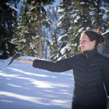 Minulý týden v práci byl strašně dlouhý a otočilo se tu velké množství lidí. První polovinu tady trávili filmaři a dva profesionální závodníci a naše chata hostila kvalifikační část závodů Natural Selection. Jedná se o freestyle závody ve volném terénu. Většinou závodníky vozí nahoru a dolů helikoptérou nebo na saních, u nás ale byla poprvé změna a celé závody se konaly pěkně po staru pěšky. Což znamená, že všechny ráno rolba odvezla pod svah, závodníci a filmaři a fotografové nandali lyže, vyšlápli si nahoru, část se rozestavěla po kopci a závodníci vyrazili přes skály, stromy, návěje skákaje a točíce se kolem dokola dolů. Po celou dobu jim nad hlavama bzučely drony a sledovali každý jejich trik. Dole si všichni řekli “Dobrý!” a vyrazili znovu nahoru. Takhle tu blbli dohromady přes týden. My je měli asi tři dny. Ačkoli byli všichni, včetně závodníků milí, byl jich plný barák a byli rozlezlí úplně všude. Odměnou alespoň bylo, že poslední večeře bylo barbeque formou bufetu, my nemuseli roznášet a navíc přijeli kolegové zdola na kus řeči a pivo. Což pro nás byl asi tak největší hřeb závodů. Po odjezdu je vystřídali noví hosté a nečekaně se tu dala dohromady báječná parta lidí, o kterých jsme později prohlásili, že byli naši nejlepší hosté a my se cítili, jako když vám domů přijede banda tetiček, strejdů a kámošů, se kterými kecáte, popíjíte a máte se dobře. Mimo jiné se Zuzce povedlo poprvé krmit z ruky místní sojky, které jsou zvědavé a když dostatečnou chvíli stojíte s nataženou rukou, máte velkou pravděpodobnost, že vám do ní sednou. U toho jí navíc jedna z hostek, čínská babička, která byla náhodou malířka, vyfotila a později podle fotky Zuzce namalovala obrázek, který jí na závěr pobytu věnovala (Zuzka edit: ti ptáčci jsou úžasní, obrovské nadšení střídá ještě větší nadšení, když dostávám malovaný záznam toho okamžiku, nepopsatelná nádhera!). V sobotu jsme ocitli přesně v polovině našeho zaměstnání a od středečního příjezdu domů můžeme začít říkat, že už to budou jen čtyři týdny! Pořád nás to tu tak nějak baví, nebo jsme se spíš sžili s místním tempem, ale začíná se projevovat náročnost. Zuzku chytly trochu záda a rozjel se jí syndrom karpálního tunelu od věčného leštění skleniček a obecně přehršel fyzické aktivity. Prý možná i od běžkování. Mezi hosty pak byl mladý kanadsko/italsko rakouský pár, který aspiruje na naše další kamarády. Výhodou bylo, že Melissa je místní praktická lékařka a poradila Zuzce nějaké cviky na ruce a co může udělat pro svoje karpály.