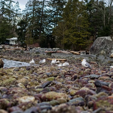 Už ve čtvrtek večer jsme si zarezervovali místa v kempu u oceánu, kde jsme se, pár týdnu nazpět, byli podívat a fotit tuleně. Z pondělí na úterý dle předpovědi mělo být z celého týdne nejkrásněji. Každý z kempů, který je provozovaný BC Parks má na webu svůj rezervační kalendář, kde si můžete vybrat termín a konkrétní místo. My horko těžko našli poslední volné místečko u oceánu a kromě této jedné noci byl kemp vybookovaný až do konce dubna. V pondělí nás z postele vytáhlo sluníčko a my se nadšeně začali chystat na výlet. Domácí nám dokonce půjčili náhradní spacák do -17° se kterým byla zaručená večerní pohodička. Sedli jsme tak do auta a vyrazili na jih, minuli jsme zatáčku a co čert nechtěl, začalo kapat. Zuzka se mračila a já jí uklidňoval, že to za chvilku přejde. V kempu jsme zaparkovali a rozhodli se, že pro jistotu stan necháme zatím složený a přikrytý plachtou, kdyby to přeci jen nepřestalo, abychom pak nenechávali zavřený mokrý stan přes týden, co budeme v práci. Vyrazili jsme k molu okouknout tuleně. U toho mě napadlo, že čeština je vlastně príma a že slovo tuleň dává perfektní smysl. Jejich halekání bylo slyšet široko daleko a nám tahle televize vydržela velmi dlouho. Počasí si s námi, ale pořád hrálo a v jednu chvíli jsme zažili současně slunečno, mlhu, déšť i duhu. Bylo nádherně, akorát ne na kempování. A to jsme tentokrát koupili dva balíky dřeva! Nakonec zvítězil rozum a my na našem zaplaceném místě jsme jen rozdělali oheň, pozorovali stoupající příliv, tuleně, racky a zbaštili opečené hotdogy a na noc prchli před deštěm do tepla domova.