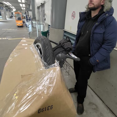 Zbývá vrátit auto na letišti ve Vancouveru a vyzvednout v místním obchoďáku naše nová kola. V autě po cestě na jih si konečně užíváme i nějaké výhledy, kdy není tma nebo zataženo a kocháme se krajinou. Přískokem se blížíme centru a nakonec přijíždíme i do obchoďáku. Po cestě se bavíme, co budeme dělat s krabicemi od kol, když máme v plánu kola hodit do auta, dojet na letiště, vrátit auto, naložit kola, u nás je vyndat a mastit to domů. Na místě nám všechno krásně usnadňují a žádné krabice nám nedávají a předávají nám rovnou připravená, nafouknutá kola tak, jak jsou. V nákupáku ještě dáváme rychlý oběd, kdy žasneme, kolik lidí je schopných se v jeden čas pohybovat na stejném místě (ano, byl Black Friday a všude lidí jak po kokot) a po jídle jedeme na letiště.