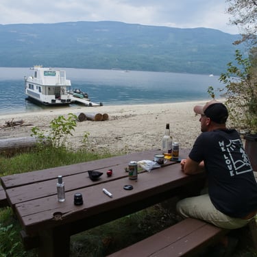 Večer po výletě přišel čas dotáhnout do konce náš inzerát na auto. Prodej jsme si schovávali někdy na poslední tři týdny a chlácholili se zkušenostmi Emmy s Charliem, kteří své auto prodali během pár dnů. Velký úklid auta a fotky interiéru jsme již měli naštěstí za sebou a zbývalo jen nafotit věci na kempování, kola, rozložený stan a sepsat text. Inzerát jsme dopsali druhý den a zveřejnili po cestě na další stanoviště v Goldenu v KFC. Během pěti minut, po odbouchnutí inzerátu začaly pípat zprávy v telefonu, jak divé. Nekecám. Během prvních deseti minut se ozvalo asi deset lidí. Pro nás skeptické lidi, to samozřejmě vyvolávalo spoustu pochybností, zda se jedná o reálné lidi s reálným zájmem. Nechali jsme tak telefon postupně pípat a vydali se do Halfway hot springs asi hodinu cesty na jih od Revelstoku. Na Coryho doporučení jsme se nevydali do Vancouveru obvyklou cestou, ale o dvě údolí jinudy a stejně tak na Coryho doporučení vybrali na přespání zmíněné horké jezírka. Jednalo se o přírodní jezírka u řeky s malým kempem pod správou BC Parks, kde by opět mělo být first come, first serve. Po přeplutí malým trajektem přes jezero a ujetí asi dvaceti kilometrů jsme odbočili z hlavní silnice na štěrkovku a vydali se stoupat asi 14 kilometrů do odlehlejšího údolí. Už po cestě v mapách jsme četli recenze na kemp, kde mu dlouhá léta šéfuje Bob, co prý má být milý člověk. Postupně se za námi zařadí další dvě auta, která se na nás trochu lepí, ale my nechceme aby nás předjeli a nevzali nám místo, takže to nakonec i docela valíme, štěrkovce navzdory. U toho nám jen jede hlavou, jaká by byla paráda, kdyby se nám takovou jízdou nerozsvítila kontrolka motoru nebo nezačalo bouchat něco na podvozku případně neprolétl kamínek z kolem jedoucího auta, který by nám rozbil čelní sklo. Bylo by to náramné takhle čtrnáct dní před odjezdem. Nic se naštěstí nestalo, ani po zbytek cestování, ale tahle radši ani nahlas nevyslovená paranoia nás provázela oba celou cestu a svěřili jsme se o ní navzájem až po prodeji.