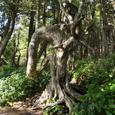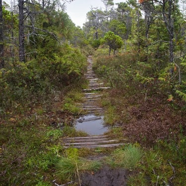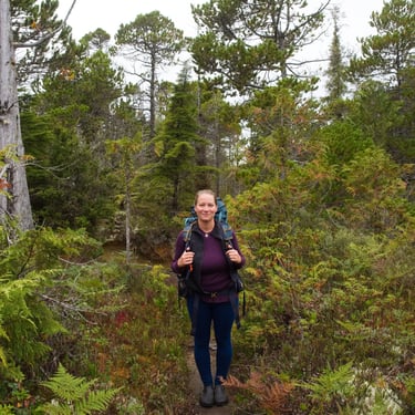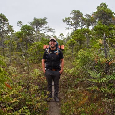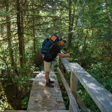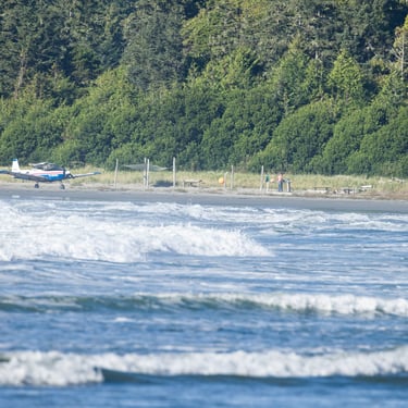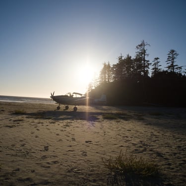 Mělo nás čekat devadesát minut chůze skrz celý ostrov na druhou stranu, kde je v zálivu obří písečná pláž. Schůdnost cesty byla tak na hraně. Začátek byl velmi zarostlý, kdy cesta místy neměla snad ani půl metru a z obou stran husté listnaté křoví. Postupně se přidaly polorozpadlé, až rozpadlé dřevěné cestičky přes louže a mokřiny. V prostřední třetině se les trochu více otevřel, přibylo místa na obou stranách, mokřiny se rozšířily a nám se otevřela příroda, kterou bychom tam vůbec nečekali. Tam to pro změnu vypadalo, jak ve Středozemí. Takový klečovitý pokroucený borovice, traviny a vprostřed cesta. Někde v tomhle místě jsme potkali dvě holčiny, jak se s krosnami na zádech a surfovými prkny prodírají z druhé strany. Prý po cestě potkali před námi akorát dva místňáky se psem a na místě je jeden chlápek s letadlem, ale že tam taky spát nebude. S letadlem? Jojo, přiletěl si opíct buřta. Za slíbených devadesát minut přicházíme na zmíněnou pláž do Ahous Bay. Byla to nádhera. Asi tak tříkilometrová písečná pláž, vůně oceánu, mírná mlha od tříštící se vody z vln, asi patnáct stupňů a krásná divoká příroda. Odhodili jsme batohy, na lehko se šli projít po pláži a prozkoumat, kde se utáboříme. Během chvilky jsme v oceánu spatřili první velrybí dýchanec. Nejdřív jsme tomu nechtěli ani věřit, ale když se opakoval asi třetí, nebylo o čem pochybovat. Je to oblíbené místo na trase k Aljašce, kde se velryby zastavují a my jich za večer pozorovali několik. Neuvěřitelný pocit, když padesát metrů od vás v oceánu pomalu proplouvají velryby. Ty, co jsme viděli tam byly Gray whale. Nakonec jsme se utábořili na druhém konci pláže, kde byl dříve zmíněný pán s letadlem. Měl to zabrané dobře. Nebyl tam poprvé a na „jeho“ konec pláže prý létá pravidelně z Vancouveru, což je asi hodinka letu. Bylo to v závětří, měl tam udělaný stolek, místo, kam natáhnout plachtu v případě deště, ohniště. Zprvu se nám tam nechtělo oxidovat, ale nakonec jsme se dali do řeči, z pána vypadlo, že jeho dobrý kamarád je Čechoslovák, kterému jsme nakonec poslali českou zdravici. Ray nechal Zuzku si sednou do letadla, aby poslala fotky domů pro Láďu s Kubou, nadšené aviátory, nechal nám rozdělaný oheň a nařezal další dřevo na večer. Prostě paráda. Navečer, se bohužel ukázali další lidi a samozřejmě si hned museli rozdělat stany kousek od nás, ale my si večer nenechali zkazit a užili jsme si krásný západ slunce s velrybami a později neuvěřitelnou noční oblohu bez jediného mráčku. Ráno nás čekalo opět brzké a velmi vlhké probuzení. Vlhké vzhledem k místu hned u oceánu a brzké díky tomu, že jsme museli stihnout objednané taxi a ještě týž den zase asi pětihodinový přesun autem. Cestu zpět jsme stihli snad asi za hodinku neb jsme šli již více na lehko a dřív než bychom tušili jsme seděli zase v autě.